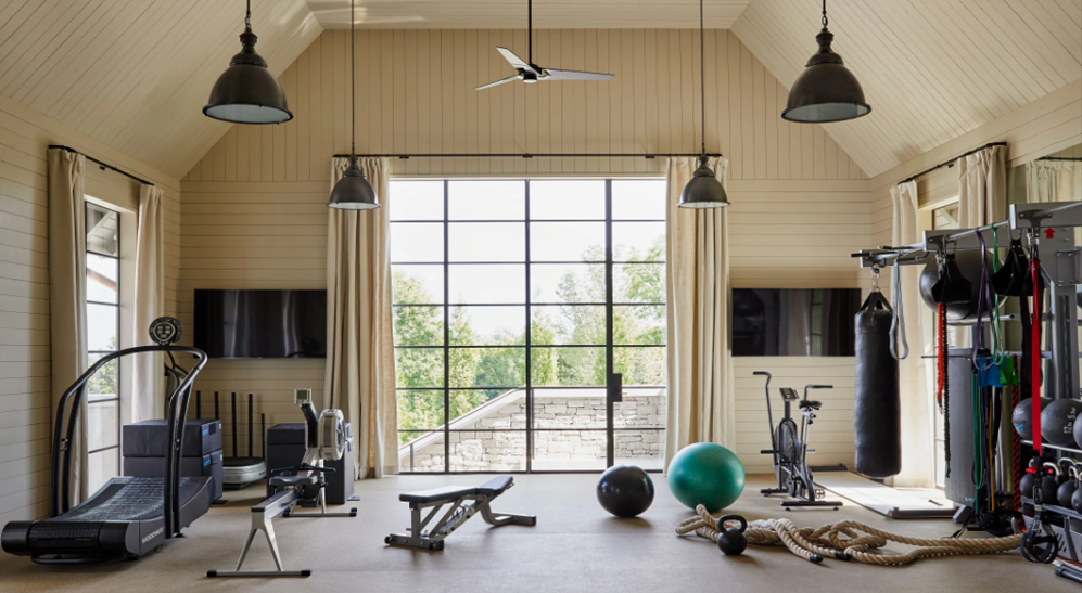 - El área del gimnasio debe estar muy bien iluminada, siendo recomendable que reciba luz natural. Esto ayudará a que te sientas más motivado para hacer tu rutina de ejercicios y puedas relajarte.